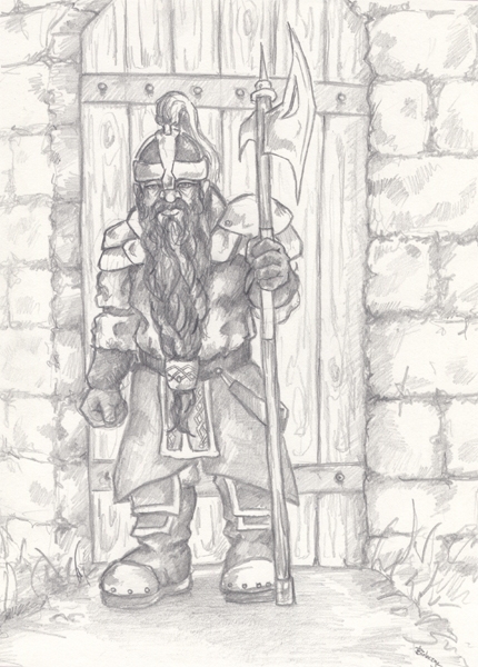 Good proportions. Doesn't just look like a short, bearded human. Good beard. Don't hesitate to use a straight edge to get a "crisper" look for the things that need it (axe, iron bands and wood planks on door, etc.). Good job.