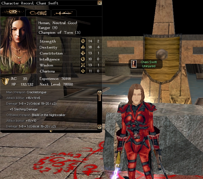 Even after helping to slay the mighty warlord that was their enemy, Chani found herself in danger. Led to ruin in front of the Queen and her King of Tethyr, Chani took great pleasure in hunting down the duplicitous members of the Crimson Guard, and ultimately their leader Daramus. And when the girl she had helped nurse and train for the campaign, Eleana, too betrayed her, even if the girl had been mislead by Daramus, Chani felt little mercy for either of them.