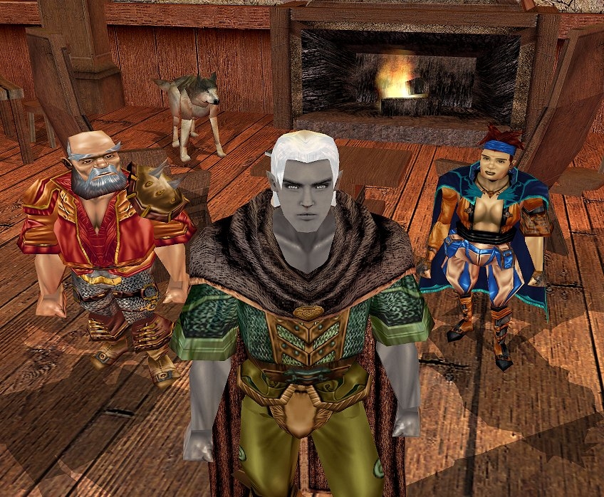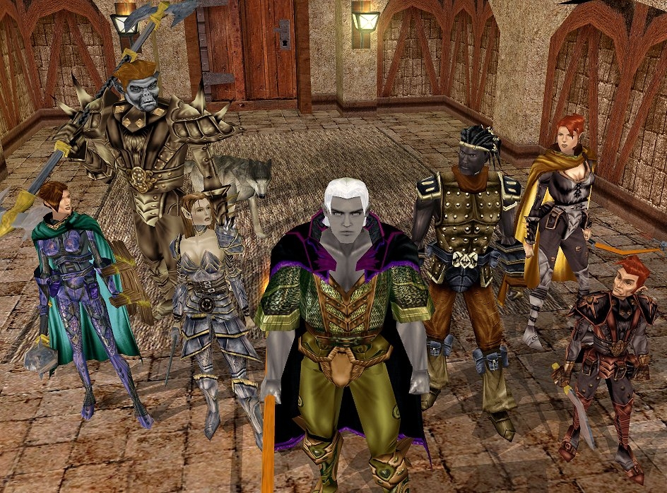 Zhandigal at the Mercenary Guild of Port Last with his wolf Nott, Aribeth and Aarin, and all the companions who helped him in this adventure: Linu, Sharwyn, Tomi and Dalean.