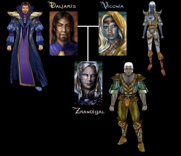 This is the genealogyc tree of Zhandigal. His father Daljaris of Candlekeep was the last of the sons of Bhaal, a human archmage who renounced to the inmortality becoming a mortal male. His mother was Viconia DeVir, a Shar�s cleric who left Menzoberranzan and disowned Lolth� cult.