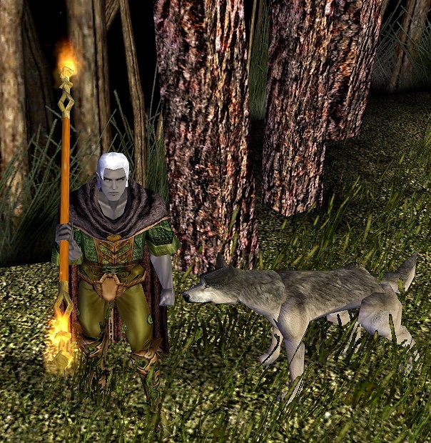 Zhandigal and his wolf Nott walking by the woods near Neverwinter.