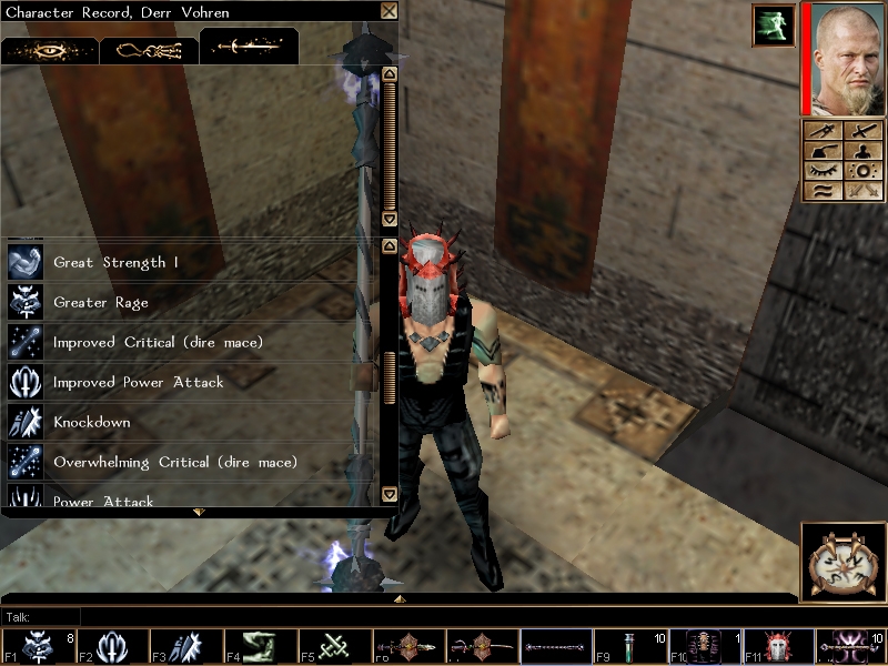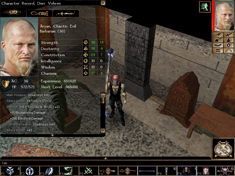 100% pure barbaryan blood (level 30). Best weapons and armors, expert with dire mace, carefully chosen feats and skills, millions in cash, items and attacks carefully placed on quich slots.