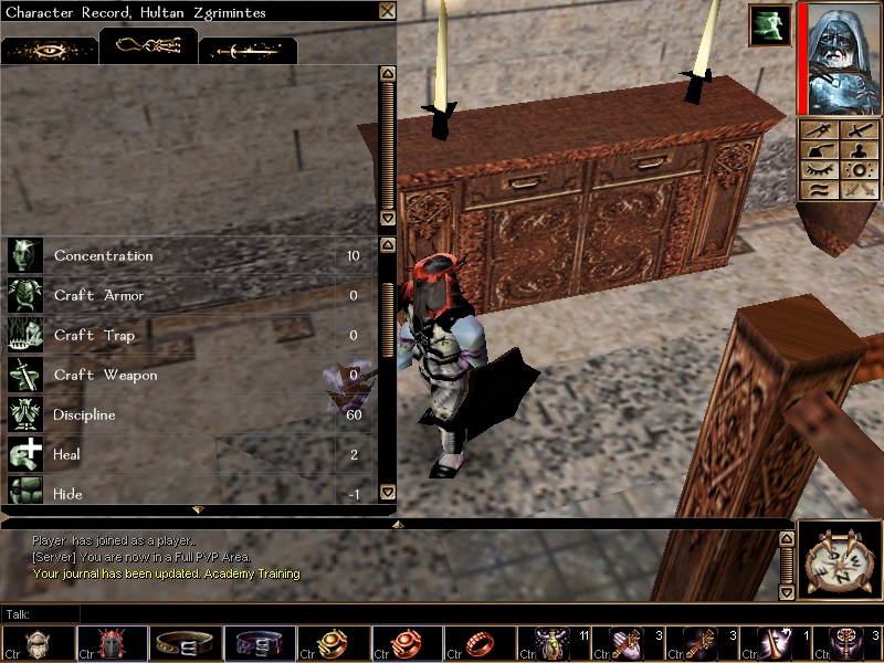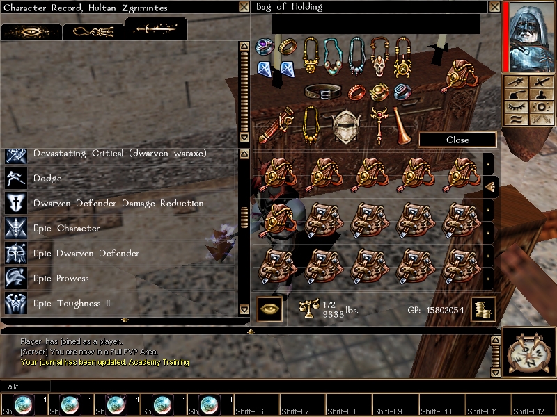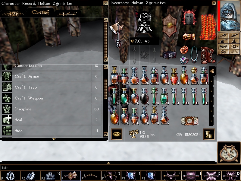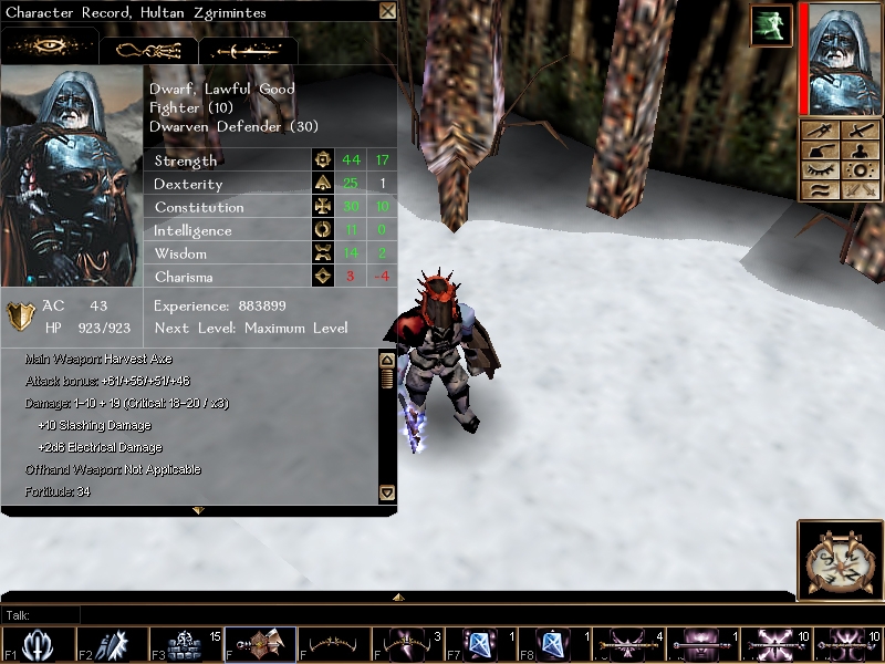 Abilities  Exceedingly efficient in battle; almost maximum hitpoints; tremendous main weapon(see screenshots), no weight carry problem, hasted, enlightened, spell imunity (death, disease, poison, level decrease etc.) etc.