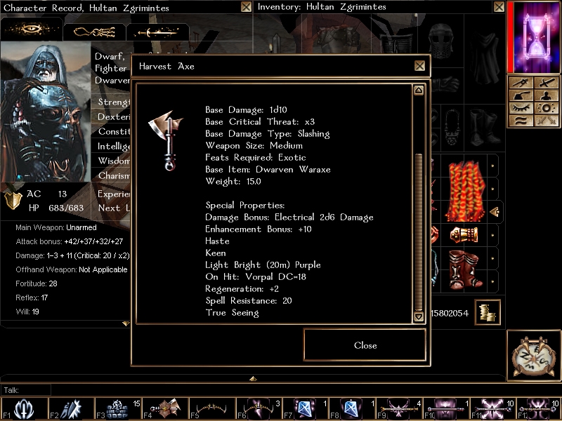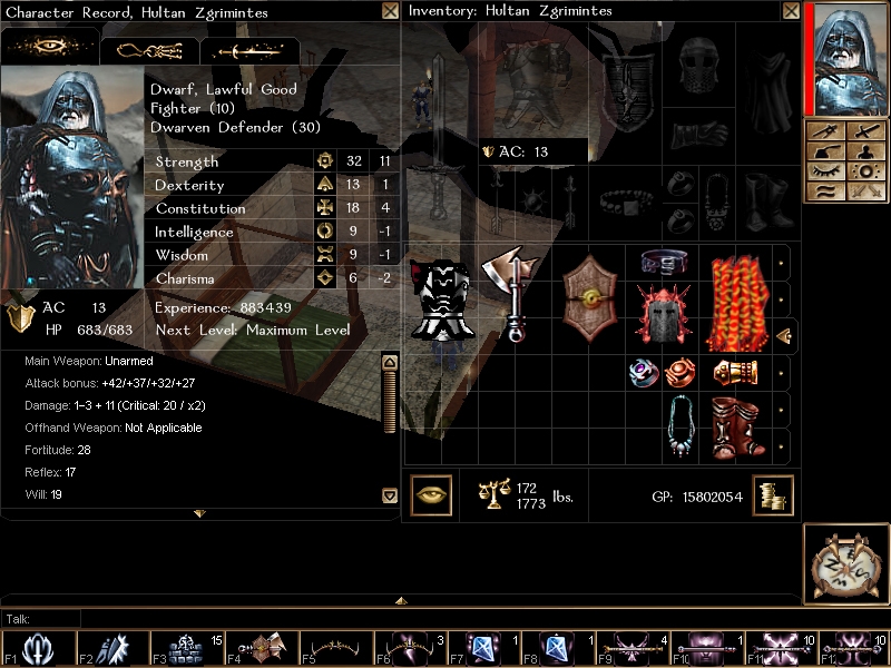 UPGRADE. Standard Bioware character, with standard equipment. Took a lot of patience to build. No spells, no potions required just get there and charge into battle. This type fighter-dwarven defender, its the very definition of a TANK. Focused strongly on strength:). Do not worry, roleplaying its perfectly covered with items for charisma, wisdom, persuade, lore etc. Contains all the items from first campaign's henchmen at maximum level and Nash's items from Underdark. Designed for battle. Enjoy