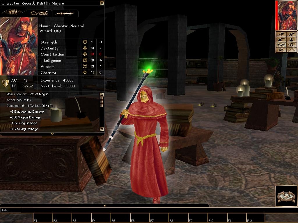 At last I have completed both of my Raistlin Majere characters from the DragonLance Saga. This is Raist as I picture him just before he turns to the black robes. He is a lvl 10 Wizard. But because of the robe and staff you might have to have HOTU or SoU for this to work right, I dunno. I used CODI's Character Creater to give him the metalic gold skin all over and I put all of the items he should have on him. No Haks needed ,thank God. I hope yall will like him ,let me know how I did. DRAGONLANCE ROCKS!!!!!! BLAZE007