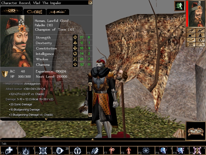 Wow, ZarZuf, thank you for such honest vote... Have you read neverwinter nights' description for lawful evil, lawful good or chaotic evil in order to place my character so determined into one or another? Have u done some research on Vlad in order to be so blunt? Chaotic evil is for thieves and backstabbers and traitors, u dare say Vlad was one of those? He was cruel, sadistic, yes, but only with evil. And the character that fights evil with all costs is a paladin. Anyway, I'm wasting my time _________________________ The enemy of my enemy is my friend. And I have a lot of enemies. So where the fock are those friends?!