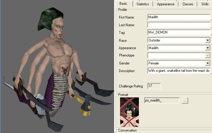 Sorrey to complane and play the devil but Mariliths are supposed to be good looking from the top up in all other art and chr stat of like 22 as average .fangs monster yess sometimes even scaled but good looking in a demonic sort of way! your wor is great so please foregive me but it had to be said that B#tch is ugly!!! do a update for us sickoes out there !