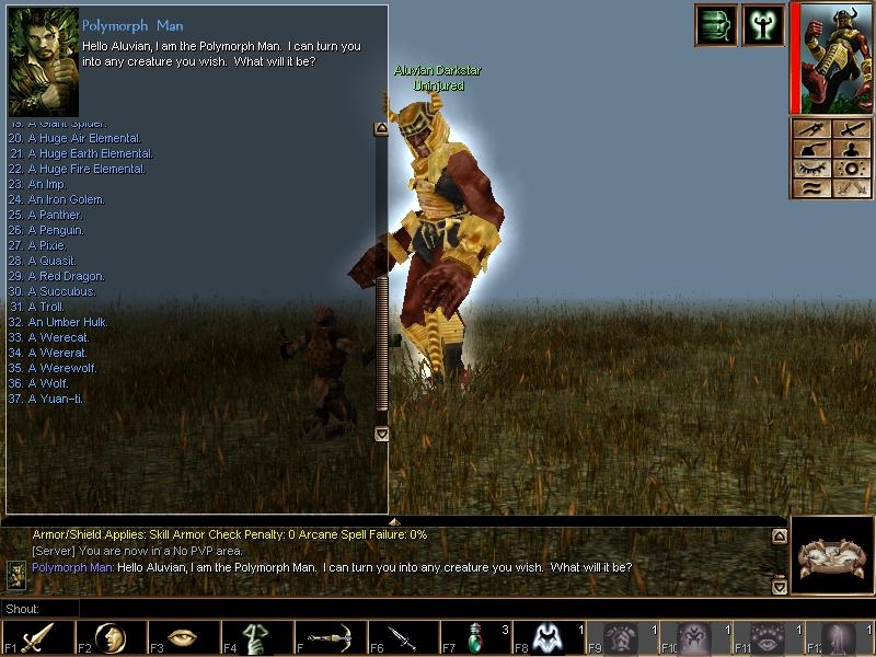 This is an NPC polymorpher. Just speak to him and he can turn your character into any of the 38 polymorph types you want. The Conversation is now organized by creature type. Now has 2 onspawn scripts. The first script, 'man_os_1' has a 6/10 chance of turning the NPC into a balor, bear, dragon, penguin, iron golem, or troll. The second onspawn, 'man_os_2' supports all 38 polymorphs and has a 3/40 chance of the NPC NOT being polymorphed. Includes a Demo module and Readme.