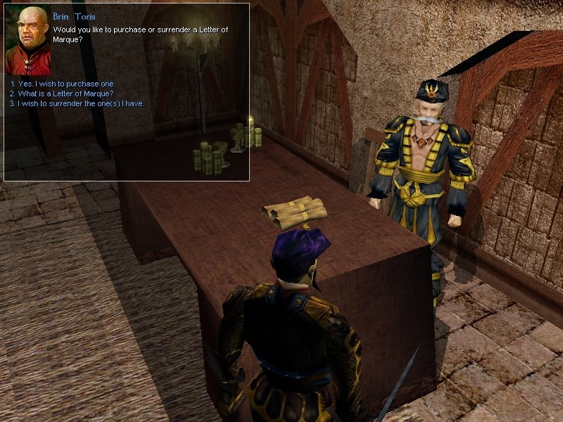 This is a banker who sells letters of credit. I call them letters of marque even though the name is incorrectly applied, but I think it sounds better. This is mainly a device for persistent worlds that have a character lose gold when they respawn. This letter is actually an insurance policy against such an eventuallity. They also address the problem of characters walking around with thousands of gold. They come in three denominations 1,000, 5,000 and 10,000 gold piece letters. There is also a charge. They are also honored at merchants, but the character will receive less there, depending on how the merchant is set.