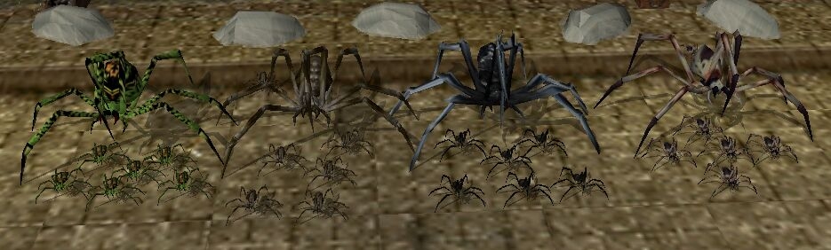 This zip archive contains all the files you need to add four new spiderlings to your module. The spiderling model was created by Solomani, and modified with Bioware textures for Giant Spiders, Dire Spiders, Sword Spiders and Phase Spiders. An .erf file is included so you can import the new creatures to your custom creature pallatte, with statistics based on weaker versions of the adult spiders. The .erf also adds custom placeable cocoons, which will spawn a horde of spiderlings when destroyed (spell casters will need to be careful of their area effect spells), and a custom generic trigger that will cause the nearest cocoon to break open (place this around cocoons to spawn baby spiders when players walk too close.) I also added custom versions of the adult spiders, with modified OnDeath scripts that will cause the closest cocoon within 20 meters to break when it dies. Thanks to Solomani for the spiderling model.