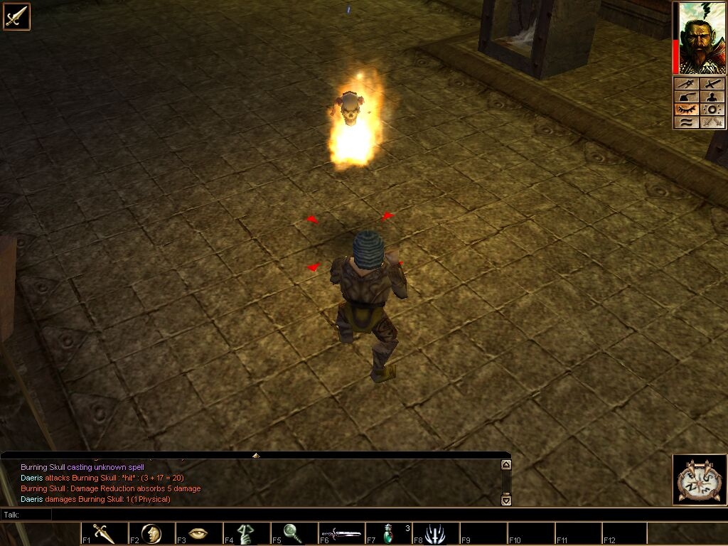 The burning skull is an undead created by wizard to gaurd important areas or treasure. The tormented creature is bathed in fire and uses its torment to strike out at all who come within its reach. Simple creature from toolset no hak needed.