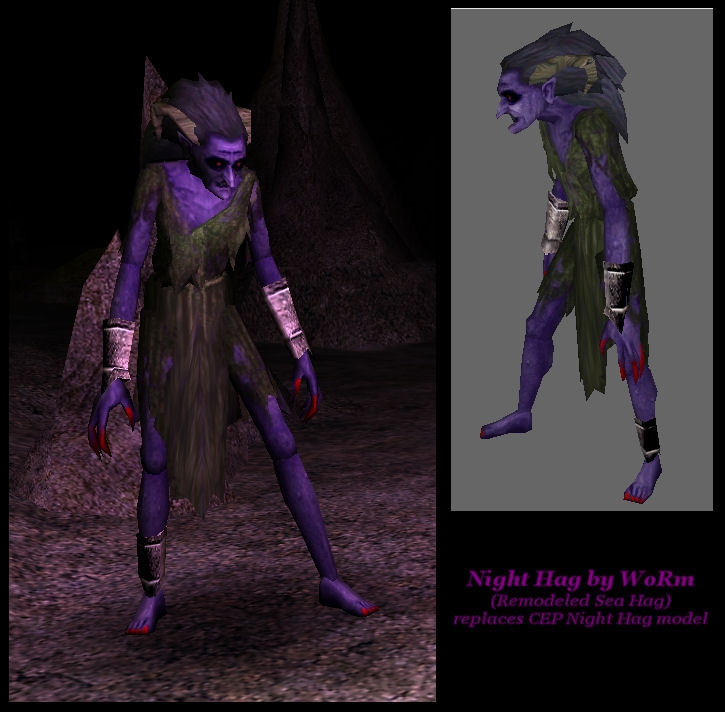 This is a remodeling of the Night Hag that is available in the CEP (originally altered by fkirenicus). I felt that just having purple tinted skin really didn't do it for me so I added a few extra touches to give your Night Hag an identity that better resembles WotC artwork. You must have CEP v1 or 2 installed to use this, as this .hak contains only the .mdl file and textures, the CEP provides the appearance.2da and portraits. place this hak above everything CEP and your good to go.