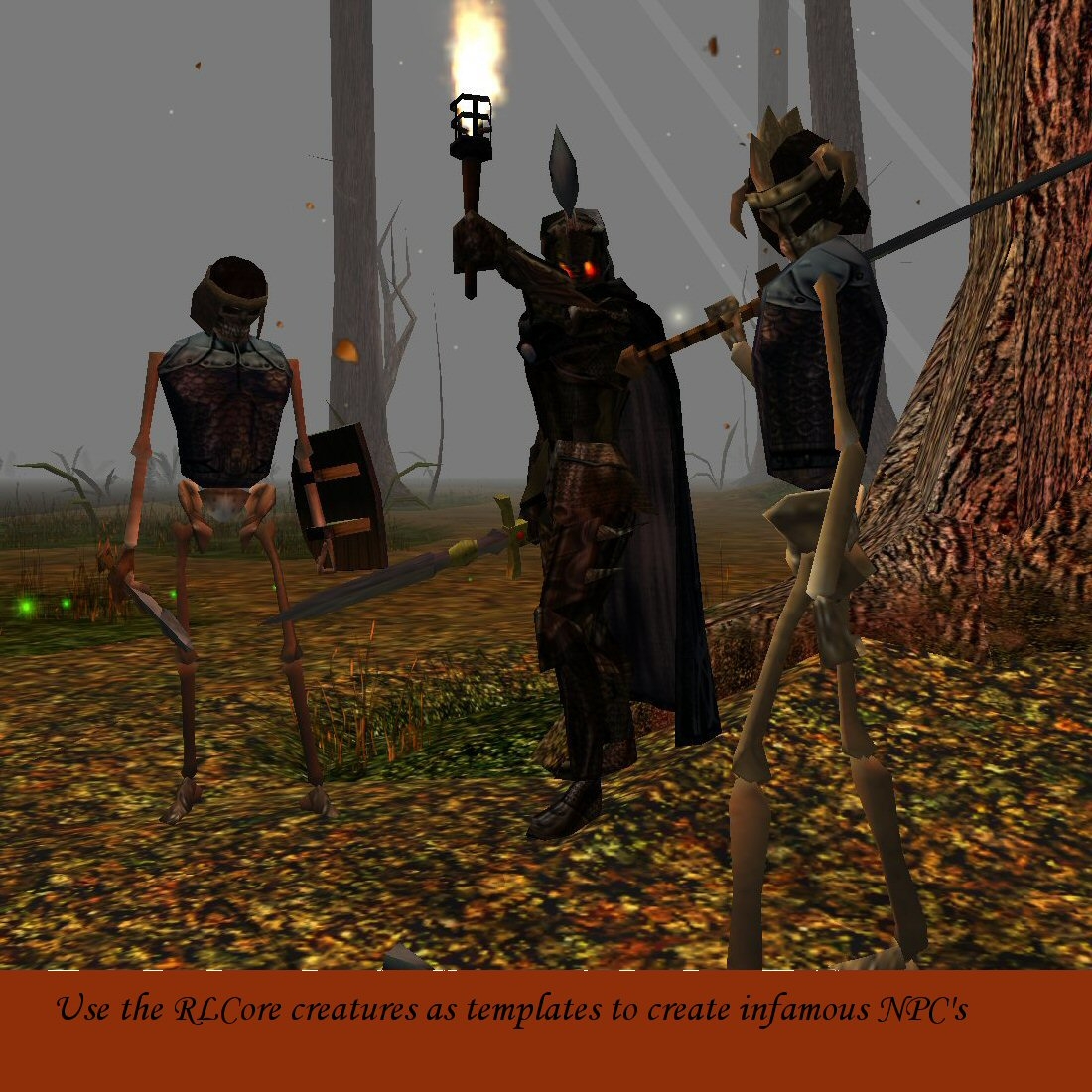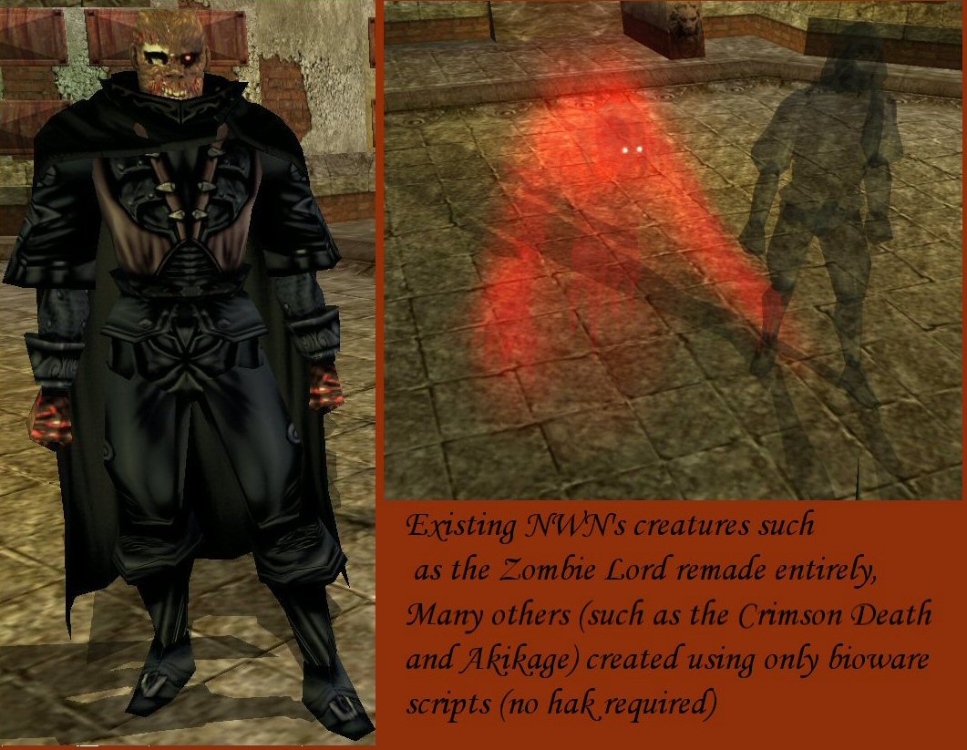 Existing NWN creatures, such as the Zombie Lord, remade entirely. Others (such as the Crimson Death and Akikage) created using only bioware scripts and vfx (no hak required).