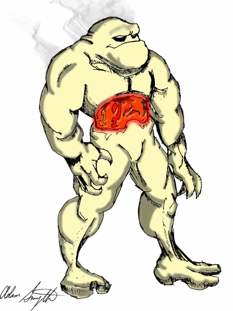 Breath Weapon (Su): Cloud of nauseating gas as a free action. Berserk (Ex): When hit it has to make a DC12 will save or go berserk. Berserk is implemented by the Confusion effect. Magic Immunity (Ex): Calzone golems are immune to all spells, spell-like abilities, and supernatural effects, except as follows. Cold-based effects slow them (as the slowspell) for 2d6 rounds, no saving throw. Fire-based effects deal no damage but rather harden the golem temporarily, increasing its natural armor bonus by +1 for every 3 points of damage it would otherwise deal (this hardening fades after 1d4 hours). The golem rolls no saving throw against fire effects. Spurt (Ex): When hit it does a spurt of 1 point fire damage to all creatures within 5 feet.