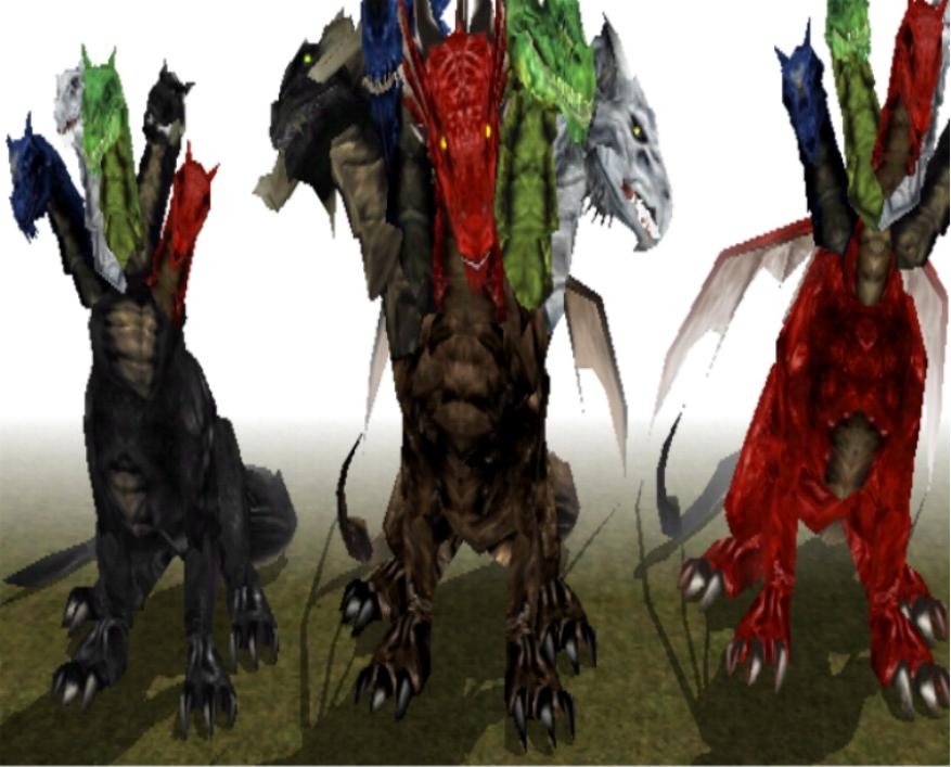 These two Tiamat models were made mainly for the CCP.Tiamat has been created twice before by two different modelers and now there is a new version. The first model I encountered on the vault had a red body and a somewhat hydra-like appearance other than having wings. The CCP also had a Tiamat model that was a bit smaller with a black body and the same hydra-like nature but it lacked wings so I began work on a new version. I decided to abandon the hydra type neck structure and give her five evenly spaced heads that are appropriately sized for the individual dragons they come from in comparison to the others present. Also I created new skins especialy for her. She is described as having a brown body in all the updated entries so now she does. I also created a version that has the old striped description. If you look at her you'll see that the stripes are diferent on the right side from the left. (It's a neat little trick I've been using to give a single chest model two entirely diferent skins.) Both the new models have glowing eyes that are the appropriate colors for the eyes on the various heads and the heads themselves match the Bioware dragons. The pic shows a comparison of the previous two Tiamat models to the new style. The new ones are bigger than the older versions and maneuver with a much smoother motion. I also included new portraits for her that feature the Cult of Tiamat preying at her feet. I also have a great many Temple of Tiamat placeables including statues and am looking for some assistance with a matching tileset if anyone is interested in adding one to their mods.