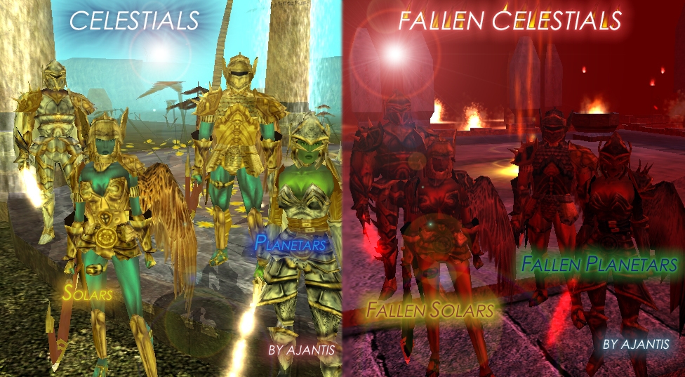Finally, MORE Celestials to add to YOUR module. You dont have to put up with the limited selection provided so far, with this you can add the awsome Solar, Planetar, and their Fallen, evil counterparts that have descended from the sublime heights of the Upper Planes. They are based off the original versions from the Monster Manual 3.5, but modified a bit, especially in appearence. Instead of bland, boring, and bald.....they have got some style. Male and Female versions included for each. The female Solar appearence I based off the one in BG2:ToB, as well as the Fallen Solar. Custom, powerful, supernatural weapons and armor included for each of them. Isn't it about time to add some flavour to your module? Expect more volumes to come, and even updates. ---Ajantis out.