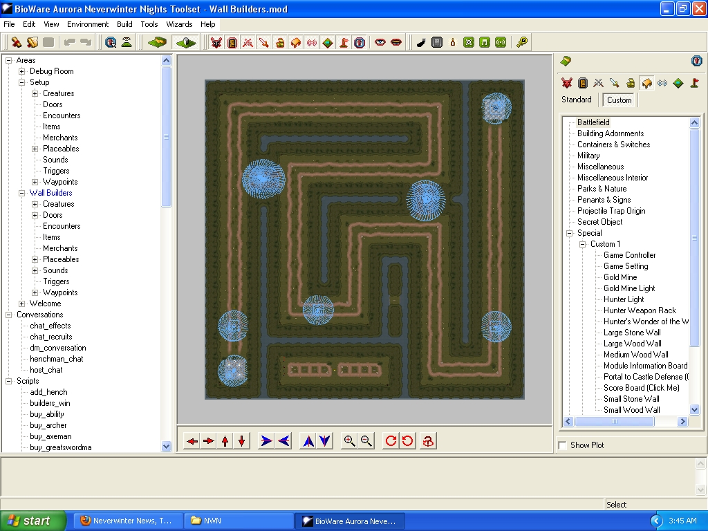 A quick screenshot of the module in the toolset and some of it's areas, items, design, etc. Sorry for the zoom out but, this gives you an idea how the map is laid out. It might look pretty simple in design but, that is the whole point. Wall Builders was designed to be pretty simple to play and let's new players catch on very quickly. I will post more screenshots later when I have some players in the game.