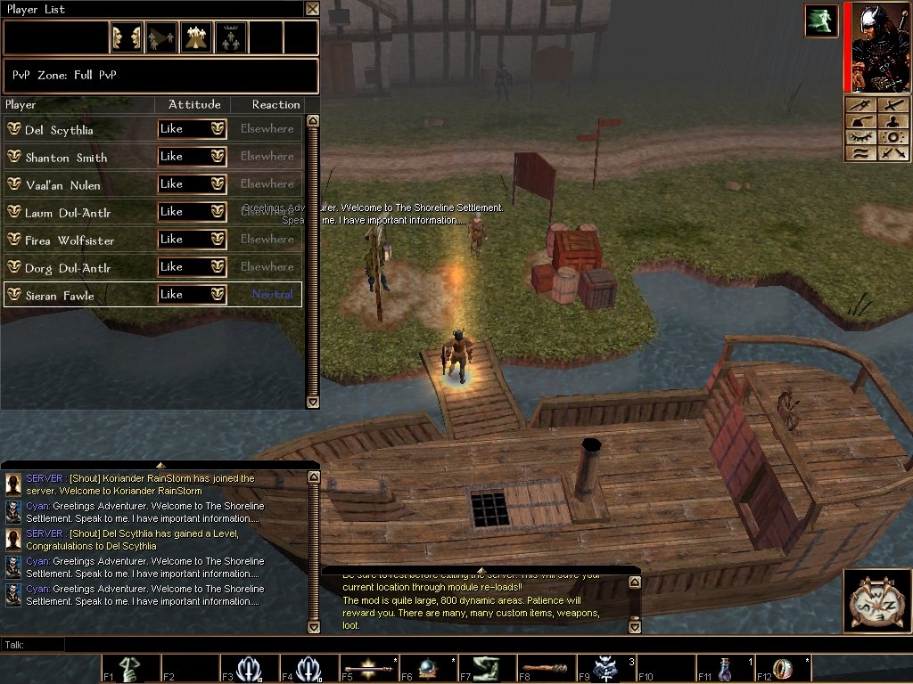ServerName: Zeus Ephistius, under Action; Thanks: kadamait & Big_A3/XL-Bever for the original mods! Uses the Playerys Resource Consortium Prestige Classes & Spells. There are hundreds of unique items and NPCs in a world comprised of over 800 areas. The use of the Stone of Recall is implemented. There are hundereds of unique items with special properties including the glass eye which allows you to locate other players on the server. Forge of Wonders in Shoreline Settlement that you can use to add ANY special property to a weapon, for a price of course...... Updates: Locations are now saved persistently through server resets, be sure to rest where you want to start back. Your character file is saved continually The Bulletin Board is now persistent. Some journal entries are now persistent, including the Epic Seven Jewels Quest. Multiple Quests throughout the game areas. Level 40 is attainable and playable. PRC Info: http://nwnprc.netgamers.co.uk/index1.html