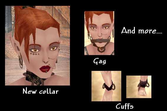 Those collars are nice, there are however a lot of big holes in the hakpak, which are not visible, and the gag part seems a little weird. is it used for headless npcs or something like that? 3rd, the texture of the nose chain combination thingie seems buggy. the texture is missing.