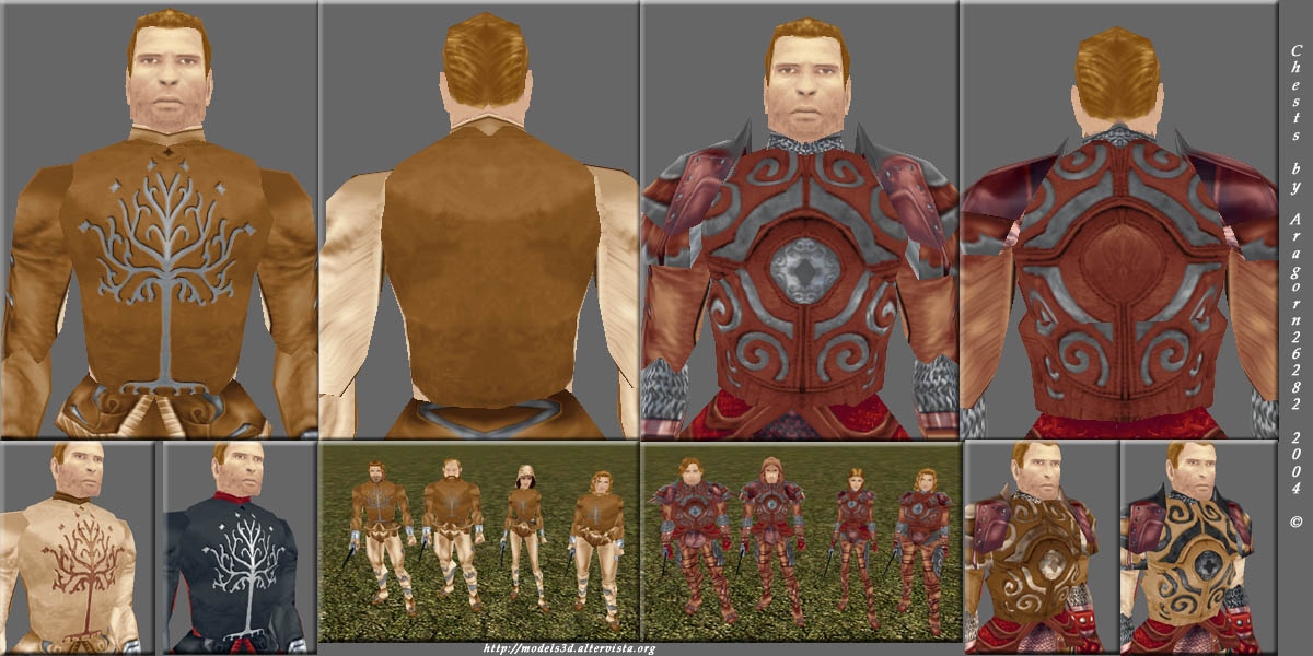 Lord of the Rings armors by Aragorn26282 This hak contains two types of chest models to create custom armors inspired by 'The Lord of The Rings' movies. It adds a Gondor armor and a Rohan armor. As shown in the picture you can fully equip the armor with the other body parts as preferred. In the file you can also find a module I've made to show how I intend to represent the armors. The armors have a CA of 3 since they are mostly leather armors. Created for TDM NWN shard at http://tdm.hgn.it Known issues: the Gondor chest model for the male fat phenotype has a bug. While it is perfect in the Aurora toolset, in the game the texture doesn't appear correctly. I hope I will fix this, maybe with your help. Thanks. Aragorn26282 http://models3d.altervista.org