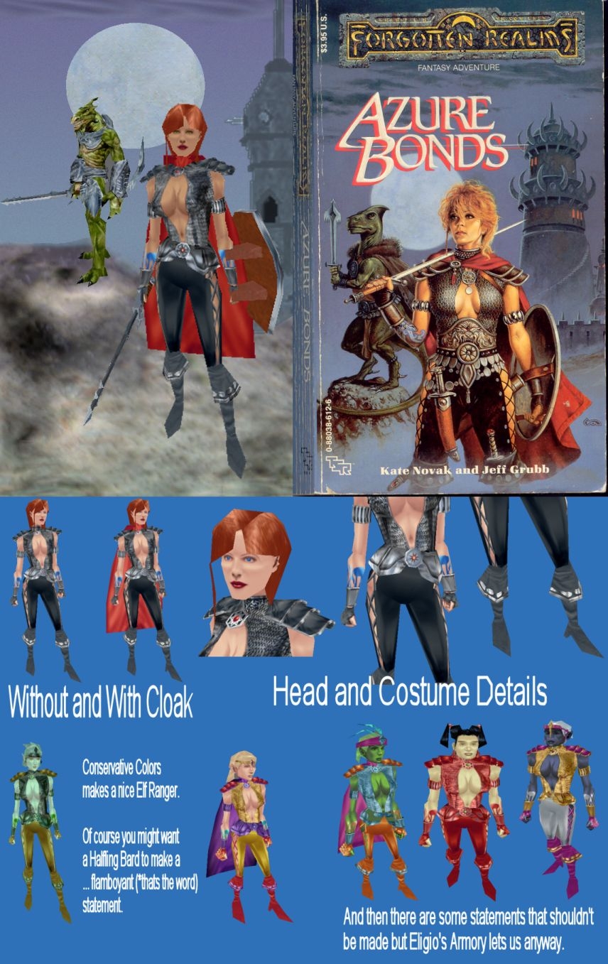 Forgotten Realms Fans should recognize her (I hope). The intrepid adventuress (yes, read the book cover back) Alias in her 'Bond-age' outfit. Makes Aribeth look well armored. ;) I made her to be my new DM character. ************Expanded to both sexes both pheno in my new hak: Now included in CLOTHES HORSE SoU/1.3 Padded