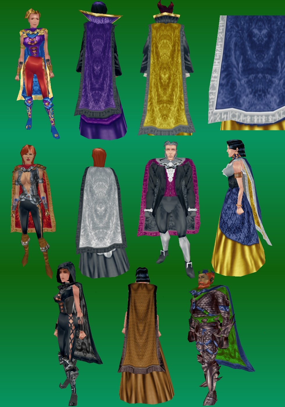I designed these specifically to work prettily with my long skirts and robes. Personally, I rarly use cloaks on PC's as even the best ones have issues - but I wanted some for my NPC's and all the others clipped long skirts badly and just were not very pretty. For reasons explained in my analysis document, I use altered Kinarr's cloaks for plane jane looks. ******* OK, at the last second - I decided to toss in my plainer texture for the narrow cloak too - so there are three cloaks in all.