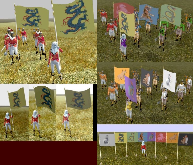 Included are 8 'Risk' inspired banners in both carried and placeable formats. Both kinds whip around nicely in the breezes (will be stiff indoors or in other windless areas).*****************The README file includes complete directions on how to PERSONALIZE the logos for your mod and how to make multiple versions for your opposing armies. Especially, since mine are, well a little girly maybe ;)