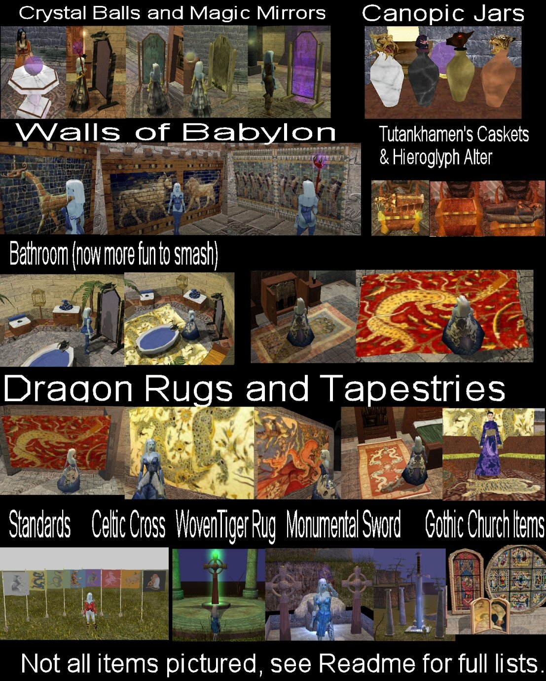 This hak contains all my placeables and their portraits. Many models have been altered & improved since initial release and the old separate haks were NOT updated. If you want my improved models you must use this hak. Any future releases will be made as addons to this hak.__________ NEW ERF file to import all the basic items - no properties preset.