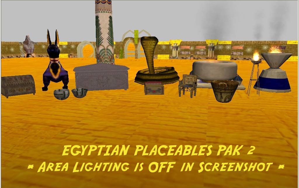 Egyptian-style placeables for your desert adventures. *Note: The thrones were tested with the SEI sit script and worked fine when tested, its unknown if it will work with any others, but possible.*
