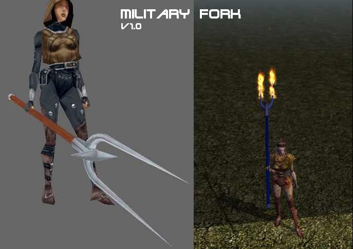 Loosely based on the Blackened Arcanium Ravager from Dark Age of Camelot, this mod uses the Halberd as its core weapon. A number of colours are included, as well as mods that allow effects to be positioned in the correct place upon the model. Sorry about the poor screenshot...it's hard to fit the fork on the screen in the toolset.