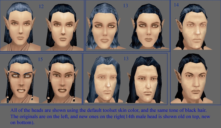 This pack overrides some of the default Bioware elven heads that were included in the HotU expansion pack. In a few cases, it was just darkening the hair/facial features, but some of the heads entailed significant changes to the texture/mesh(female heads 13 and 15, male head 14). A full list of changes can be seen in the readme file. It is in intended for use in your override folder, but includes a HAK version as well.