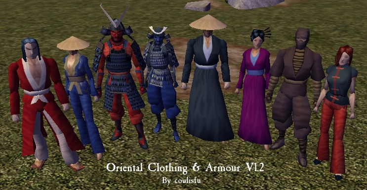 This hak add several new armour and clothing parts of an oriental theme. The parts are only useable by human male and female(thin phenotype only). The parts included should be able to make four basic outfits, kungfu, samurai, ninja and kimono/splitcoat. I've also included some helms to make samurai kabuto, ninja cowls and a conical peasant hat. There is an erf with some examples of what you can make. I've also included a link to an online reference sheet in the zip.