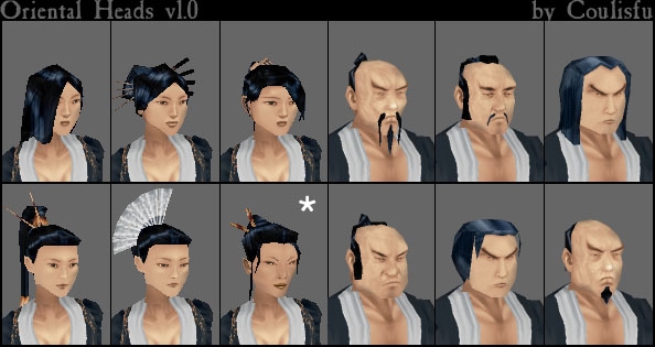 12 oriental heads for Nwn. 6 for the guys and 6 for the gals(human,thinphenotype only). All heads are numbered under 50 so they are available for character creation(singleplayer) and do not overwrite new HOTU heads. the head in the screenshot marked with a star is not a head I made but one I found in a hak somewhere(sorry not quite sure who made it originally).