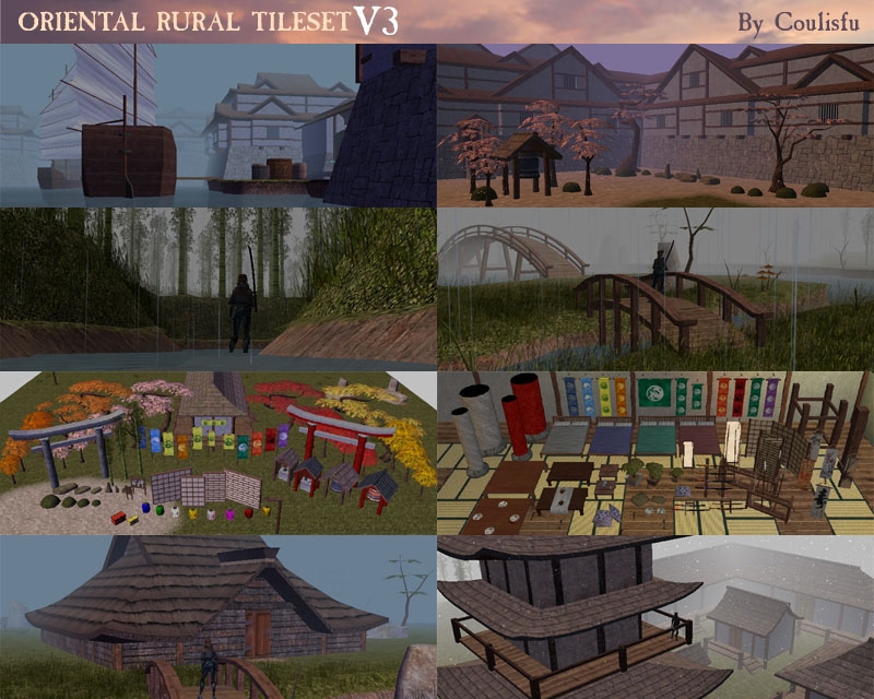 Okay here it is Oriental Rural V3. This my 3rd version of the tileset which adds oriental themed content to the Rural tileset. NEW TO THIS VERSION... Rock Garden terrains, oriental fishing boats and ships, water castles, building terrain edge tiles, lots of placables and Ixion's coastlines.