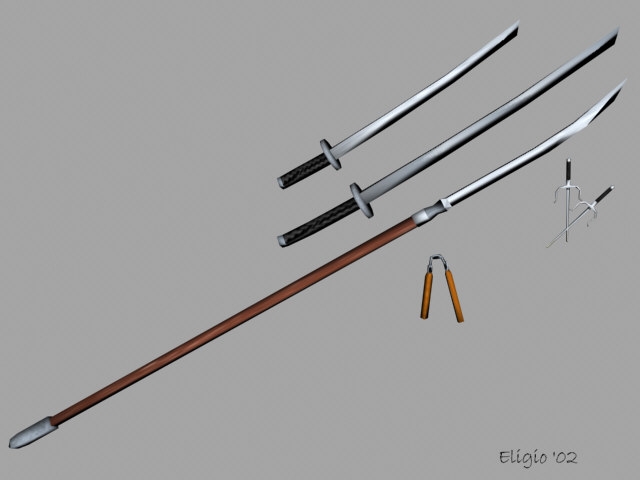 This is version 4 of the Japanese Weapon Pack. It contains models for the new katana, wakizashi, naginata, nunchuka, and sai. Updated for SoU and I cleaned up some of the texture mapping and smoothing groups.
