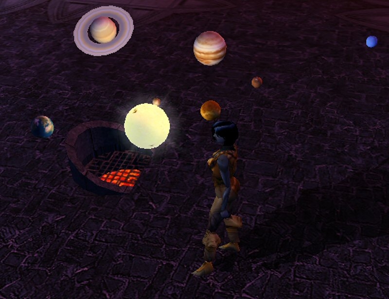 This is a placeable animated model of our solar system. The idea is to add atmosphere to an area, particularly something like a wizards labarotory. Real orreries are constructed with the planets at the end of motorized arms. In this one the planets are free floating so it can be considered a 'magical' orrery. I made it as accurate as possible, but if you know something about the scale of our universe, a lot of scaling has to be done to put everything in a viewable range. The orbits are eliptical and the planets tilted but they don't spin on their axis. Again, if the planets spun in the right speed relative to their orbits, they would be spinning too fast to see. I am also working on a more fantastic orrery which would include the animated arms but will bear no resemblance to our universe. There are three versions in the hak; they are identical except for different orbital speeds. The models look the best when in a darkened area.