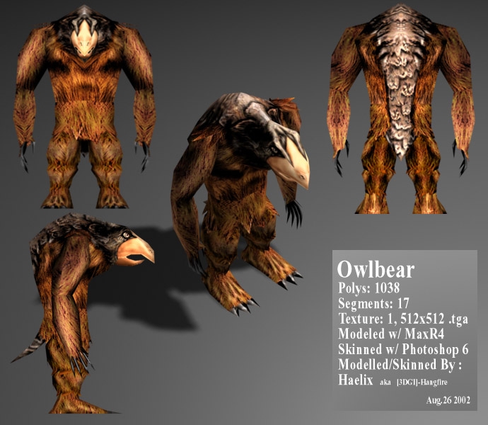This is the updated final release of the Owlbear model. Most all the changes are to the animations, redid the run animation to be a 4 legged trot instead of a 2 legged run. As well as fixing a problem in al anims where there was little or no vertical movement by the model, due to some lost keyframes. The animations are a huge improvement over the original 1/2beta released versions, and are the final release. Other fixes include fixing the appearance.2da to auto associate the included portraits whenever the Owlbear is selected as an appearance. Also included is a .erf file for import that contains the 3e fully modified version of an Owlbear for drag and drop Owlbears after the .haks installed. The Owlbear Refined file does not work, this is the proper download. Anyone having problems with no anims, its due to downloading the Owlbear Refined file which is FUBAR... this is the real final release