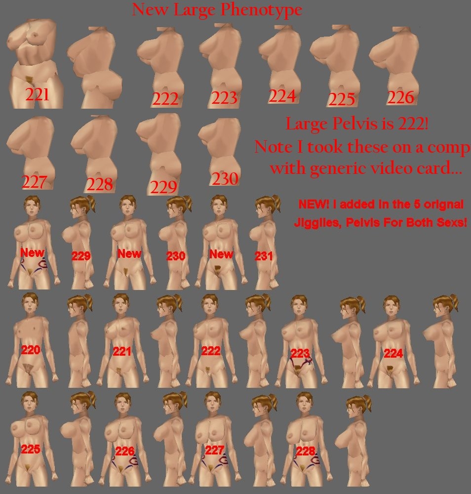 Kai: I added some large pheno type versions in. I created them for my new race, and thought I'd add them to this pack. I wanted a fat looking female (221) rather than just enlarged normal women :)