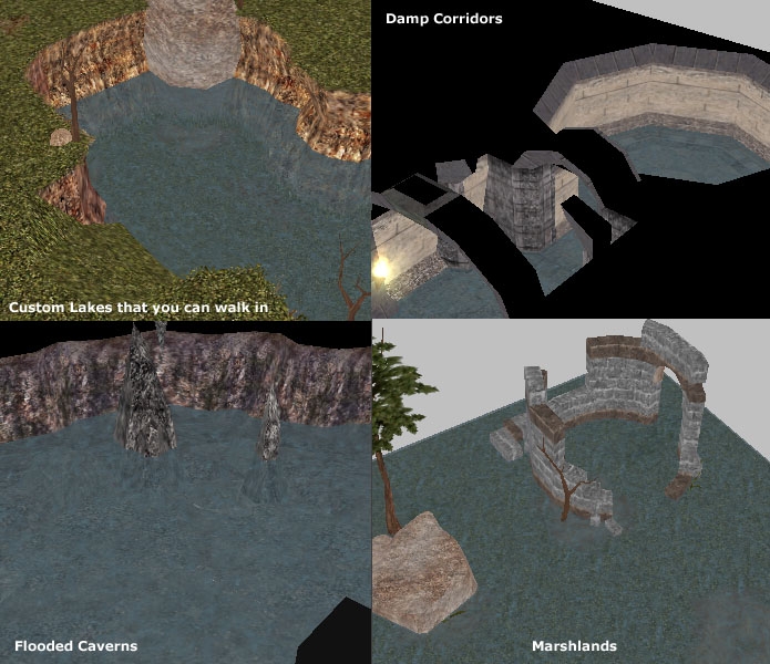 Included are several placeable water tiles. They're somewhat tricky to use, but let you create some nice water effects cheaply (e.g. no need to create new tiles). There are three levels included - low, medium, and high, as well as two sizes (1x1 and 4x4). These allow you to create some quite nice effects such as swamps, marshlands, flooded caverns, and so on. Included is a hak pack, an erf, and a sample module to demonstrate a few concepts. Read the readme.txt for instructions and important hints on how to use.