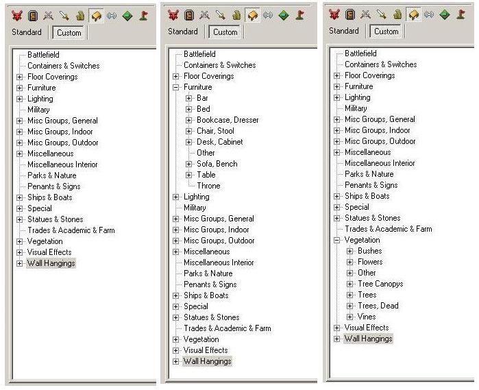 The twist here is added Category/Subcategory entries in the 'Custom' placeables list. Having seen 'Expanded Placeables' by Merle, I liked the idea but was dissappointed that he didn't provide expandable lists like 'Special' expands to become 'Custom 1-5'. I dug into the placeablepal.itp and created the needed structures. I have added 9 expandable categories containing a total of 63 subcategories. (see screen shot for example expansions). Having this nice structure I added a lot of placeables to it, currently it includes placeables from 61 placeable packages from the vault. Merle noted that this technique didn't work in the DMClient, which is true but it does make them sort better there due to naming convention. Please check the 'ReadMe' for details of how to install as the process is different for NwN or SoU.