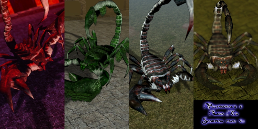 Update of Poly's classic Giant Scorpion. Now with complete animations, new models, new mapping and 5 different sises ranging from small to colossal! Version 1.1 additions include portraits for the new models and a small animation fix that just grated on my nerves. Not to mention that other little boo boo I didn't even see until I was updating this.