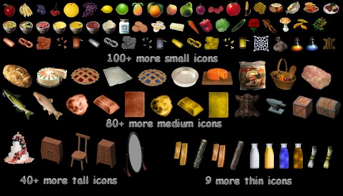 This HAK contains a modified BASEITEMS.2DA and 338 new inventory icons. To use, just place the HAK into your NWN hak directory. If you are a designer, make sure to add it under Custom Content. These inventory icons were created to be used on the Engliton PW server. Specifically, for use in Rowell's Tradeskill System, a custom built tradeskill which encompasses Alchemy, Armorsmith, Carpentry, Cooking, Farming, Fishing, Jewelcraft, Lumberjack, Mining, Tanning, Tailoring, Ritual Magic, Scribing, Stonecraft, and Weaponsmith. The icons were created from various sources, including reworked Bioware icons, a few EQ icons, images from aroudn the 'net, and some original pieces. The HAK contains the following icons: 47 Tall icons 108 Medium icons 163 Small icons 19 Thin icons 1 Wide icon (currently just a placeholder) The icons are accessible from the second Miscellaneous Size category in the item creation wizard. (Excepting Wide, as it has no standard icons).