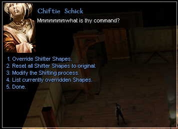 Also, in testing your item (I�ve become very interested in Shifters as of late), my character when shifting immediately gets dumped back into her normal shape and a message to the effect of ERR_TOO_MANY_INSTRUCTIONS is printed in the output window (Sorry I didn�t get the exact message and error number). Have you heard of this before? Is there a fix?