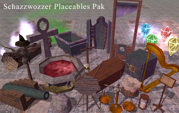 This hak pak is essentially a collection of several random placeables I've created. There are 26 totally new placeables, including a cannon, a scarecrow, a guillotine, a safe, and much more. Refer to the ReadMe file for a full list and further information.