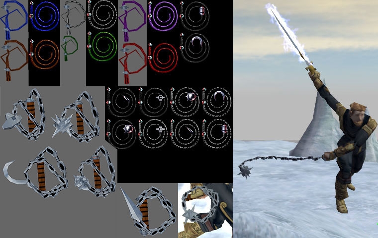 ****************************** Update 12.12.03 -Redid the chain whip, now uses actual chains instead of a whip reskin. Uses the same chain models as other weapons do. (if the model is too much for some system, or someone prefers the old chain whip let me know and I will add it back in. -Added 5 tips to the black and chain whip. Tips include spike ball, iron ball, hook, spear, and jagged square thingy (don't know the technical name for it ;@) -Replaced default black whip icon with a black whip instead of brown to stop confusion. -Updated whip test module.