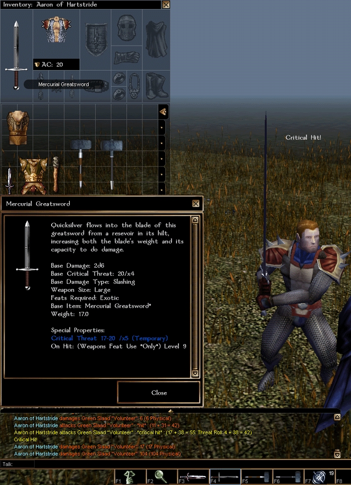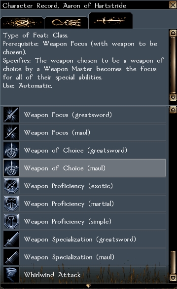 New with v1.0.7 are weapons feats. You can now have Improved Critical (falchion) or Weapon of Choice (double scimitar) for example. As of build 1.0.7e, you can even turn off any weapon visual effects in the toolset via the addition to the "Visual Effect" property of "None" as an option.