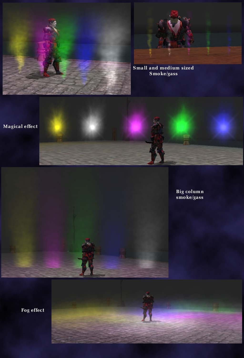 Contents: - Small medium and big column of smoke - Fog placeable - Magic effect ( just a little bonus ;oD ) All in 6 nice colours: White - Green- Blue - Yellow - Purple - Red You can find them under: Placeables (custom palette) - Visual effects. WARNING: - Do not use too many Fog placeables in one area. They are heavy on framerate. Especially when zoomed in. I hope you enjoy them. Okto UPDATE: Added red coloured placeables.