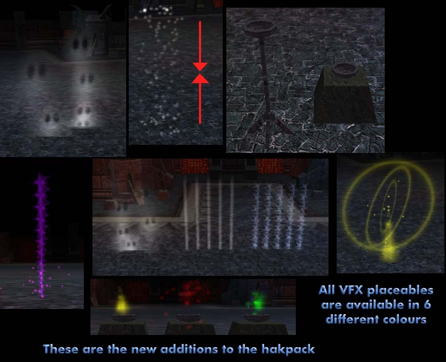 This pack contains all the VFX placeables from my other 2 packs and I added some new ones. (Only the new placeables are shown on the picture). The pack now contains 25 different VFX placeables in 6 different colours, making a total of 150 VFX placeables! -- New additions are: 3 magical (blocking) barriers - 1 new portal - 1 new sparkle - 3 magical light thingies - a ghost fountain (just for fun) - magical drill thingie. -- Also added are two foot/feet to place magical lights or fires on. -- The 2da is a bit large because I started my creations at line 4001. -- Have fun!