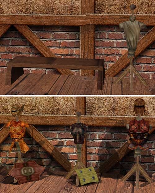 If you ever get the inclination to expand upon this, I'd love to see a separate model with the weapon bench as the default and no armor stand for weaponsmith shops. Also, I haven't done much with equippable PC parts, but how hard would it be to map the wood color to say hair so that there could be some variation in coloring while keeping the wood grain?