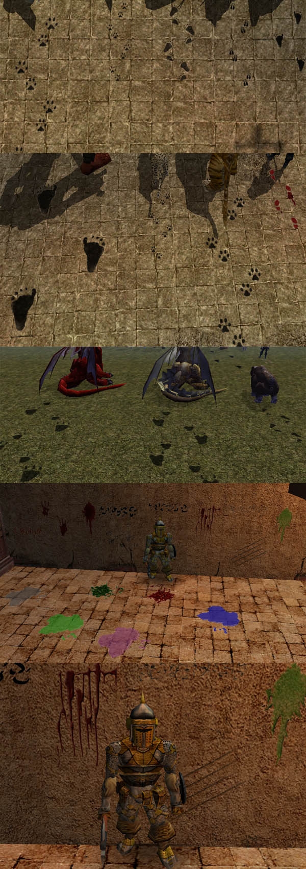 Features all the tracks from the first .hak as well as dragons, giants, great cat, and larger versions of the wolf and bear. All prints have been optimized for greater visibility on most tilesets. Also contains splats and scrawl- pools and splatters of blood and slime and several wall decorations to help reduce the monotony of the tilesets.